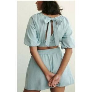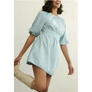 Anthropologie Love the Label Puff-Sleeved Mini Dress Chambray Tie Back SZ S NWT