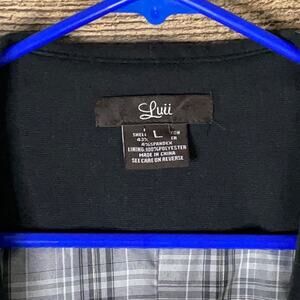 Luii vest. Size large. Color ~ Black. Plaid lining. Cascading ruffles down the front. Hook and eye closure. Front pockets. Excellent condition. Measurements are in the pictures.