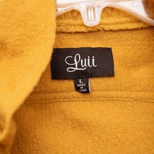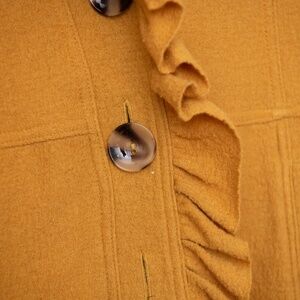 This boutique Anthropologie Luii 100% Wool Jacket is such a great find! It is a women's size Large, with a lot of stretch. It is soft and flexible, not stiff. The ruffles around the collar and down the front add such a sweet and feminine touch! The large buttons are a perfect accent. And let's face it, the mustard yellow color is AMAZING! This light weight coat is a very flattering fit! Great preowned condition!
