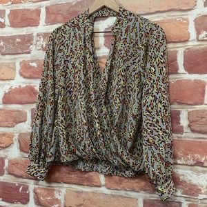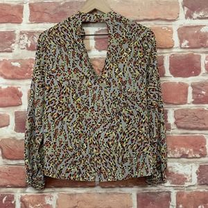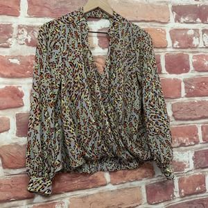 ▪️Women’s top. V neckline, pullover, abstract pattern, cutout back, mock wrap, drape front semi-sheer, high-low lengths, and long sleeves. Pre-owned. Wear it with your favorite pants!