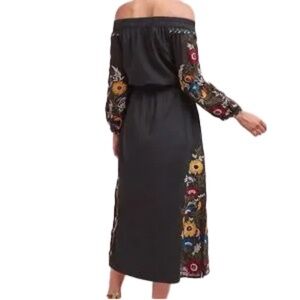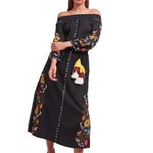 This exquisitely embroidered MISA off-the-shoulder midi dress originally purchased at Anthropologie. Perfect for any occasion that calls for a touch of elegance and worldly charm. Founded by Shadi Askari-Farhat, MISA draws inspiration from global trends and adventures, embodying a spirit of exploration and femininity. Crafted from soft cotton, this dress features a flattering off-the-shoulder silhouette, adorned with intricate embroidery and playful tassels. The removable sash cinches the waist, adding definition to the midi silhouette. With its pullover styling, this dress offers both comfort and ease of wear.