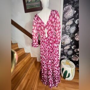 Crafted of airy pleated chiffon, Monique Lhuillier's Melanie maxi dress features a vibrant floral print and long blouson sleeves.