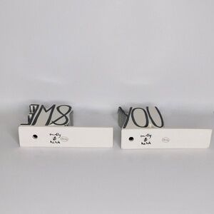 “You & Me” ceramic book end set by artist Molly Hatch, known for her whimsical and fun pop art. Book ends come as a set, perfect condition adding a lovely little pop to any home library. Two piece, black and white lettering and accents.