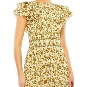 Mesmerize everyone in this charming creation by Mac Duggal 8024. Classic tailoring, this dress flaunts a vibrant floral accent printed on a chiffon fabric and is fully lined for your comfort. Features a high-neckline and back, with short flutter sleeves drawing the attention to your toned arms. This dress expresses a modest style as the skirt reveals an A-line silhouette with tiers of ruffling details which is adorable. Be the lady of the night in this dress by Mac Duggal masterpiece. Taupe yellow color.