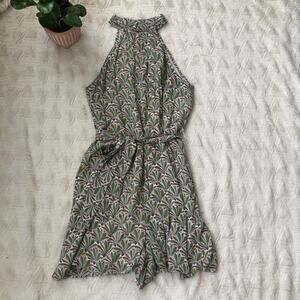 Anthropologie Maddie Palm Leaf High Neck Tie Waist Romper
