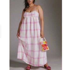Anthropologie Maeve 1X NWT Pink Plaid Linen Tie-Back Maxi Dress Bohemian 180$
