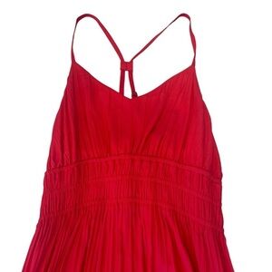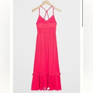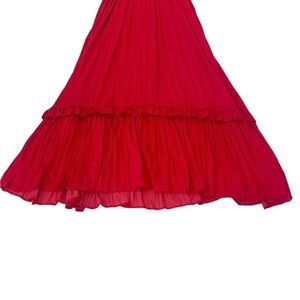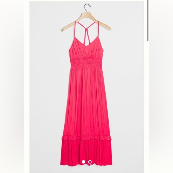 New Maeve by Anthropologie Aleda satin ruffle maxi dress in color poinsettia- red, hot pink.