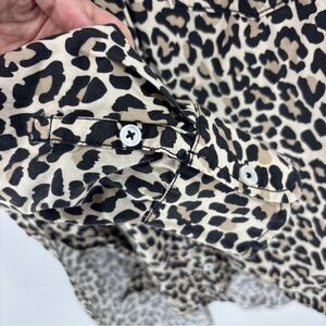 Stylish animal print shirt with button-down design. Perfect for a bold look. High low tunic cut. Long sleeve, collared shirt. Can be dressed down or up for a business casual or casual look. Good preowned condition.