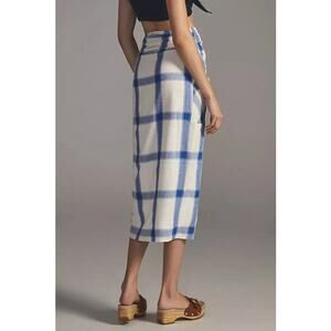 Anthropologie Maeve Asymmetric Wrap Skirt in Blue Motif. Size 0. Features high waist, asymmetric front buttons, side patch pockets, side zipper closure, wrap design with tie closure, windowpane print, and midi length. 55% Linen, 45% Viscose. Excellent condition, no flaws.