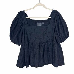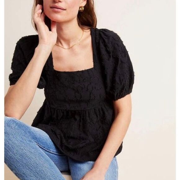 Anthropologie Maeve Batia Babydoll Top XL Black Puff Sleeve Textured Square neck