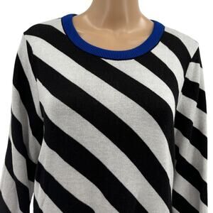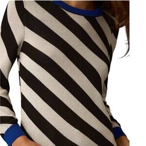 Black and white striped sweater from Anthropologie x Maeve, with blue trim details at the neck and sleeve ends. Pulls on. Long sleeves. Acrylic / viscose. Hand wash. OB1791156. In preowned condition.
