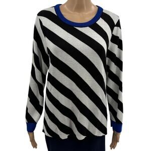 Black and white striped sweater from Anthropologie x Maeve, with blue trim details at the neck and sleeve ends. Pulls on. Long sleeves. Acrylic / viscose. Hand wash. OB1791156. In preowned condition.