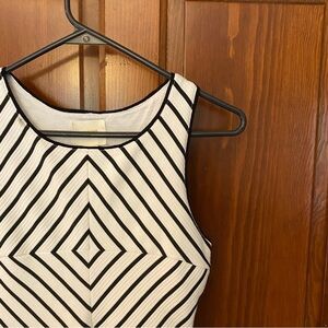 GUC black and white geometric patterned dress by Maeve sold at Anthropologie. Size 0. This dress has some good stretch to it. One small spot near the neckline as pictured. Also appears this dress was hemmed slightly. No other stains or flaws!