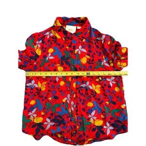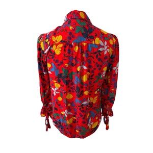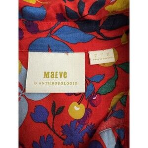 Add a pop of color to your wardrobe with this Anthropologie Maeve Blithe button-up shirt. The blouse features a vibrant floral print with a fruit design, perfect for a bohemian-inspired look. The button accents and regular fit make it a versatile piece for any occasion. This top is made for women and is available in size 2. The red color adds a touch of boldness to your outfit, while the basic style makes it easy to pair with any bottom.
