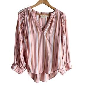Brenda Peasant Top by Anthropologie Maeve, featuring blouson puffed sleeves, spliced V neck, hi-low curved hem. Color pink motif / pink stripes.