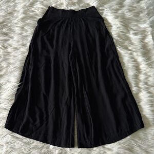 The Bristol Pants by Maeve for Anthropologie in Black. Wide-leg silhouette. Side slant pockets. Smocked back waist panel. Side zip. Gently worn with small hole at side seam that can be stitched easily. Measurements in photos.