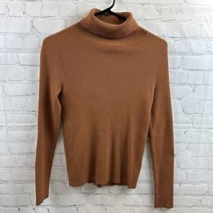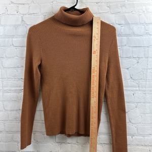 This is an Anthropologie Maeve turtleneck blouse in size Medium, featuring button sleeves and a turtleneck neckline. The color is pecan brown, made of rayon knit fabric. It has a classic fit and is suitable for casual occasions. The blouse should be hand washed only and is designed with a classic/fitted sleeve style.