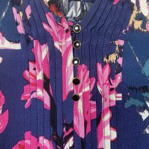 The Anthropologie Maeve Caravane Dress in size small is a boho tunic-style navy floral dress with a drop waist. This knee-length dress features a V-neckline, 3/4 sleeves, and ruffle accents. Made from rayon and viscose, it is perfect for various occasions such as travel, parties, casual outings, workwear, and business meetings. The bohemian-themed dress is ideal for summer, fall, and spring seasons, offering a stylish and comfortable option for women looking for a unique shift dress with a shirt dress and blouson style.