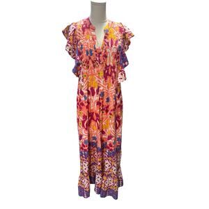 Romantic and versatile, the Maeve Cassandra Maxi Dress from Anthropologie is a must-have for any wardrobe. This women’s size XS maxi dress features flutter sleeves, a spliced V-neckline, and a pintucked bodice for flattering detail. The Henley-style button front adds a touch of casual charm, while the flowing maxi silhouette and ruffled hem create effortless movement.