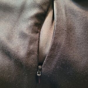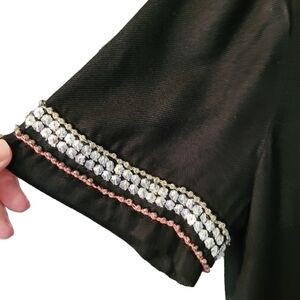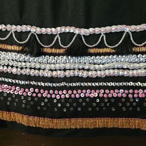 black with beading, tassels, sequins, etc at neckline, hem & sleeves