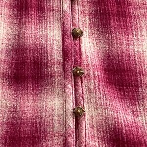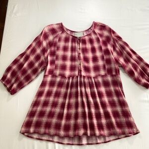 Anthropologie Maeve Cavalon peplum blouse in a soft magenta and off-white plaid.
