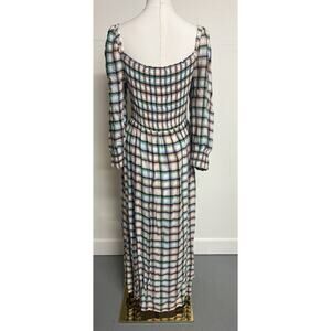 The Anthropologie Maeve Cerie Smocked Midi Prairie Dress in size M is a stylish and comfortable option for casual occasions. This multicolor check dress features a 3/4 sleeve and a pullover closure, making it easy to wear. The smocked detail adds a touch of whimsy, while the midi length and cotton blend material make it perfect for warmer seasons. With a Western, hippie, and bohemian theme, this dress is ideal for various events, from baby showers to school gatherings, adding a trendy and relaxed vibe to your wardrobe.