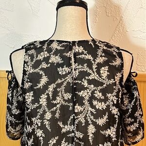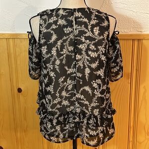 Pretty black and white cold shoulder sheer top with silver metallic threading, cute ties on sleeves, ruffle above the hemline and a keyhole back neck hook-n-eye closure. In excellent pre-loved condition. No stains or holes. Approximate measurements lying flat: