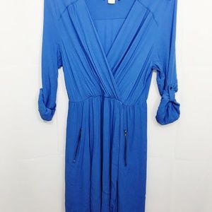 Viscose-rayon crepe. Surplice A-line silhouette. Roll-tab sleeves. Zipped side pockets. Pullover styling. Machine wash.
