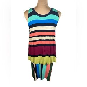 Features: Jersey stretch knit, layered overlay, notched neckline, sleeveless, allover multicolored stripes.