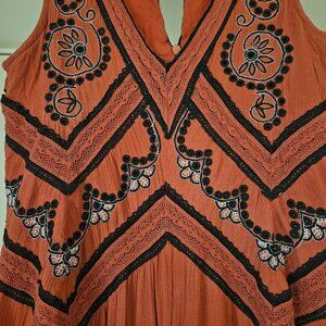 Maeve Anthropologie Desert Embroidered Orange Sleeveless Lace Oversized Flowy Jumpsuit gently used. May have some minor little loose strings and pills but nothing major. Fully lined throughout. Slightly oversized fit with zipper closure on the back. Very wide flowy legs.