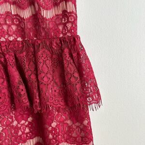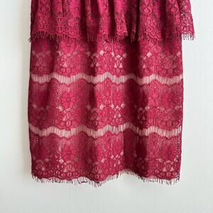 Details: Anthropologie Maeve Lace Elsa Peplum Mini Sheath Dress - Size: Small- Color: Red - Material: Cotton, nylon; polyester lining - Features: Summer soirees call for something as cheery and lighthearted as the season - a dress that doesn't take itself too seriously for a pair of shades. With a flouncy peplum skirt and fringed lace tiers, Maeve's sheath is exactly what we had in mind. Back zip. Dry clean. Stock image created by AI.