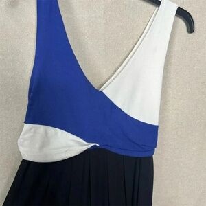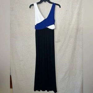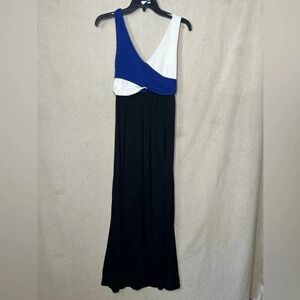 Defined by its vibrant color block design, this dress features a flowing maxi length that exudes effortless elegance. The sleeveless bodice crafted from a blend of rayon, nylon, and spandex offers a comfortable and stretchy fit, while the V-neckline adds a touch of sophistication. Perfect for any occasion, this dress promises to keep you stylish and comfortable. Pre-owned and in excellent condition.