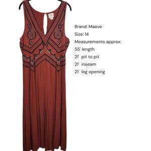The Anthropologie Maeve Embroidered Lace Burnt Orange Black Cropped Jumpsuit in size 14 is a stylish and versatile piece perfect for various occasions such as travel, parties, casual outings, or workwear. This jumpsuit features a beautiful floral pattern with embroidered accents and a sleeveless design, making it a trendy choice for women looking for a unique one-piece outfit. Made from a blend of rayon and cotton, this lace fabric jumpsuit from Anthropologie is sure to make a statement with its bold orange color and crop style, adding a touch of sophistication to any wardrobe.