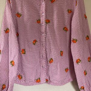 DESCRIPTION/FEATURES Orange Fruits embroidered. Seersucker. Bishop Long Sleeves with Elasticized Cuffs. Textured striped fabric in light pink and white. No pockets. Unlined 58% Cotton 42% Viscose.