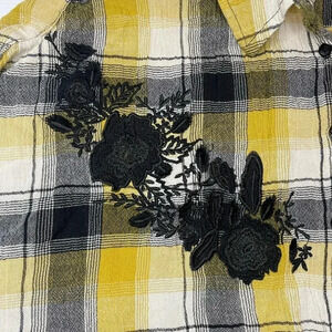 Anthropologie Maeve Embroidered Plaid Buttondown Yellow and Black Sz S Oversized