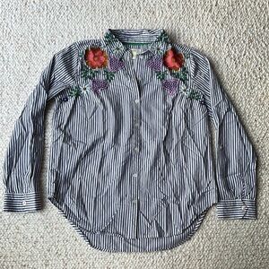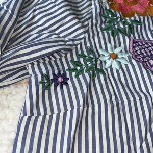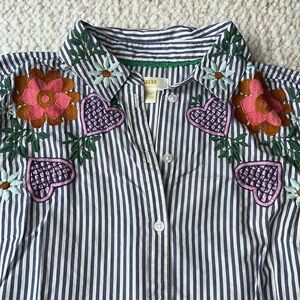 Anthropologie Maeve Floral Heart Embroidery Striped Button Down Blue White 12. This buttondown shirt by Maeve has colorful floral and heart embroidery along the front shoulders, collar, and yolk with blue & white stripes. It has button tabs on the sleeves to keep the sleeves rolled up if desired. Darting for flattering fit. 100% cotton. Approx measurements: 21“ pit to pit & 26.5-27.5“ length. Great pre-owned condition. No stains/flaws. Smoke/pet free home. Offers welcome. Bundle & save. Ship same/next day. Packaged w/ care.