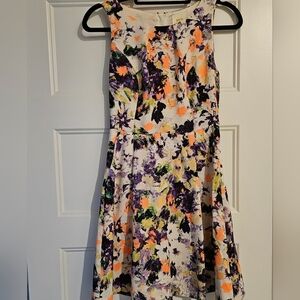 In Excellent Condition, this Flowered Sleeveless Sundress is Filled Full of Colors with Hints of Orange, Purple, Green, Yellow, Gray, Black. and White. The Dress has a Back Zipper and the Internal Lining Provides Extra Coverage. This Dress is Lightweight making it Perfect for Travel and Multiple Occasions. 98% Polyester/2% Spandex Material.