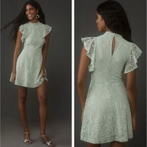 Anthropologie Maeve Flutter-Sleeve Mock-Neck Mini Dress Womens L Moss Mint Green