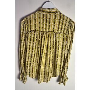 This Anthropologie button-down shirt features a charming Dachshund pattern in a vibrant yellow color. The shirt is made of soft modal fabric with a rayon texture, and it has long puff sleeves with ruffle accents and button cuffs. The collared neckline is also a button-down style, and the shirt has a regular fit with a size 2.