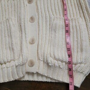 This cardigan evokes a sense of Western charm with intricate fringe details and a chunky knit texture. Its soft ivory hue and classic silhouette complement vintage aesthetics.