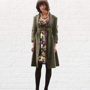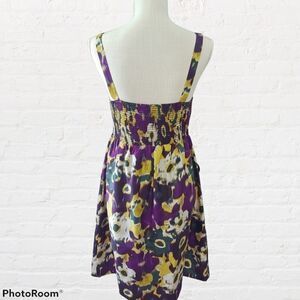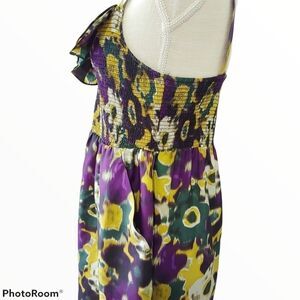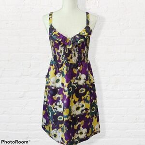 Featuring this Anthropologie Maeve silk abstract watercolor floral smocked dress with double ruffle at neck in complementary purples, greens, and yellows. Smocking at bust provides plenty of stretch. Pull on styling with pockets. Skirt is lined.