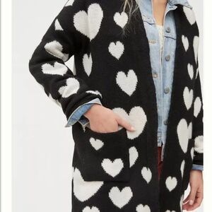 Halley Hearts cardigan by Maeve from Anthropologie. This season we're fall-ing for the coziest of cool-weather layers - and this heart-adorned cardigan is no exception. 79% acrylic, 21% polyester. Black background with a white heart pattern all over, open front, longer tunic style, soft, and quite warm. Dimensions: 31.5" = length; armpit to armpit = 28". Inside label marked to prevent store returns. Like new condition! Size XS/S.