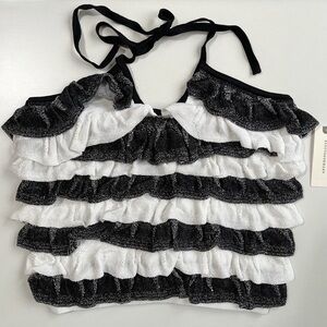 Brand new with tags Maeve for Anthropologie Halter Ruffle Sweater Tank Top in gray and white with black trim. Size small. Adjustable tie at neck. Retailed for $148. NWT.