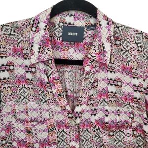 This is a pink and ivory print long-sleeved, button Front top from Maeve for Anthropologie. Abstract Print, tab sleeves two front pockets, Round hem, buttoned cuffs and collar V-neck. Has a sweet pleated detail.