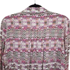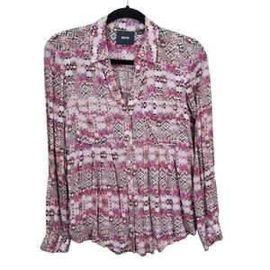 This is a pink and ivory print long-sleeved, button Front top from Maeve for Anthropologie. Abstract Print, tab sleeves two front pockets, Round hem, buttoned cuffs and collar V-neck. Has a sweet pleated detail
