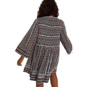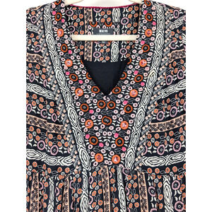 Multicolor floral print with embroidered and sequin details, fully lined, bell sleeves, v-neckline.