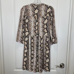 Brown, beige and white snake print Juno dress by Maeve, from Anthropologie. Hits about knee length on most people (check the measurements), three-quarter length sleeves, and a split v-neckline. Bust across the front area measures approx. 18.5 inches. Length of the dress measures approx. 35 inches. Excellent pre-owned condition.