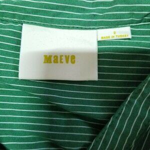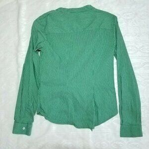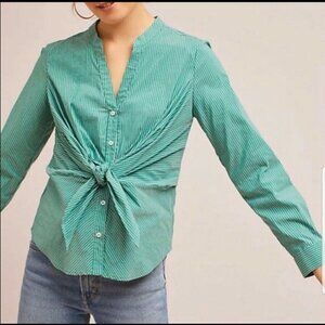 Great condition Anthro Maeve green with white pin stripes button down shirt with a knotted tie front and long sleeves. 69% cotton, 27% nylon, 4% elastane. It is a size 2 which is an XS 33-34 bust according to the anthro website. All my measurements are approximate and are based on a flat lay.