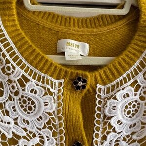 Feminine in every way! This beautiful white lace collar pops of the background of this mustard-colored sweater.