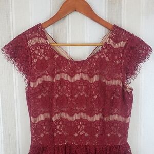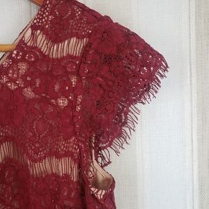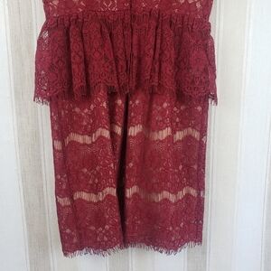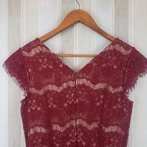 Excellent condition, all over burgundy or maroon lace lined with a nude slip, short sleeves, fun flounce at waist, just above the knee or knee length.